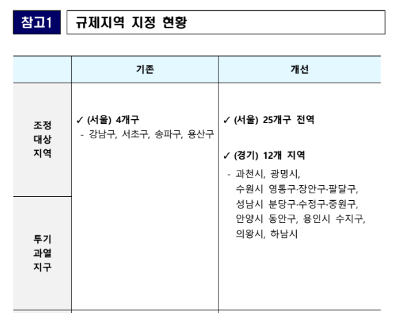 이번 조치로 서울 전역(25개 자치구)과 경기도 12개 지역이 새롭게 조정대상지역·투기과열지구로 지정되었습니다.