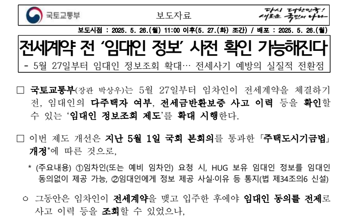 전세사기 피해자가 속출하면서 이제는 계약 전에 임대인이 신뢰할 수 있는 사람인지 먼저 확인하는 것이 무엇보다 중요해졌습니다. 2025년 5월 27일부터는 임차인이 전세계약 체결 전에 임대인의 전세보증 관련 이력과 위험 여부를 사전에 조회할 수 있는 제도가 시행되었습니다.